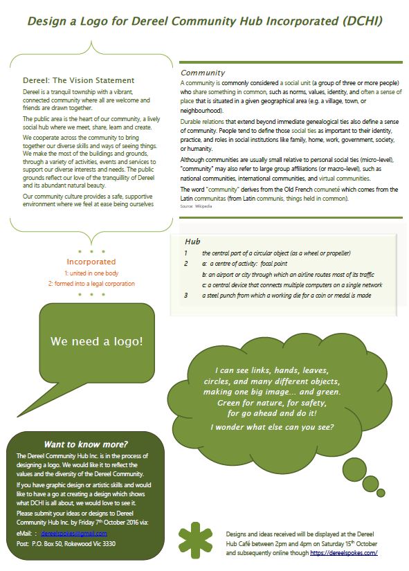 Do you like playing with ideas in a visual way? Dereel Community Hub Inc. are thinking about ideas for a logo which represents our role and our local community. We are calling for logo ideas from local people with an interest in art and design. All concepts and designs received will be displayed at the Hub Cafe on Saturday 15th October.
