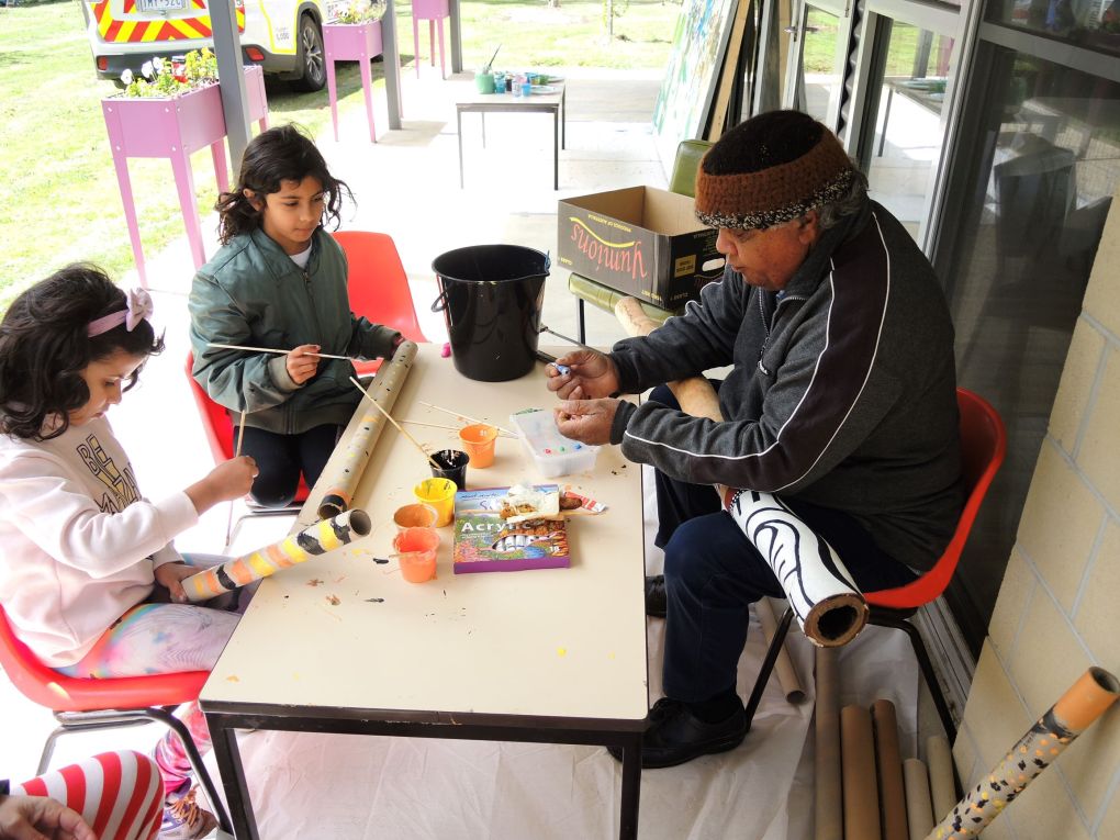 Paul Kirby teaching children how to paint didgeridoos.