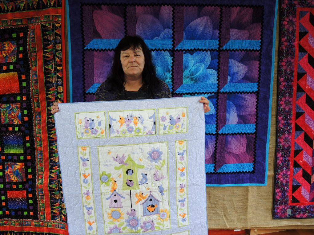 Julie Donaghy displaying her quilts.