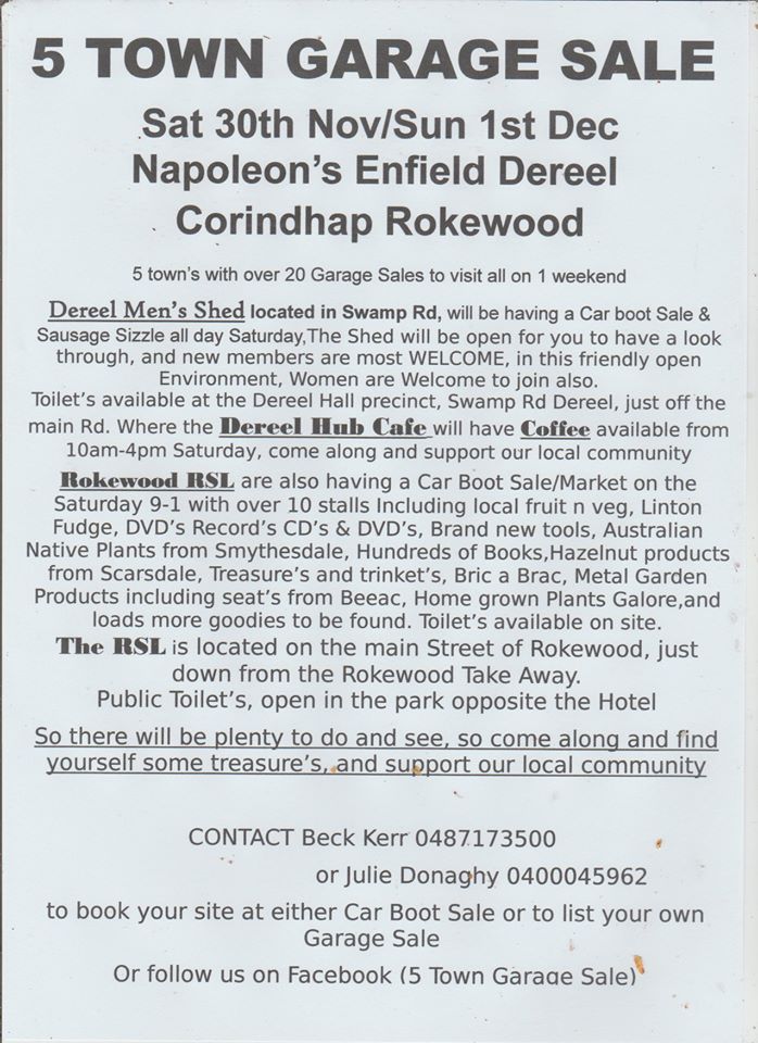 The towns of Napoleons, Enfield, Dereel, Corindhap and Rokewood and are combining to offer a trail of garage sales. This will include car-boot sales at the Dereel Men’s Shed and Rokewood RSL. Coffee is on offer in the Dereel Community Centre kitchen from 10am to 4pm.