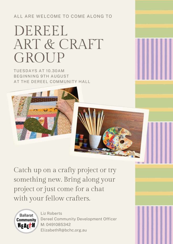 Contact Glynis Bryden on 0438 150 256 or email artindereel@gmail.com for more information or just come and chat to us on Saturday. You might also like to join the Art In Dereel Facebook Group for people who live in Dereel and surrounding communities.